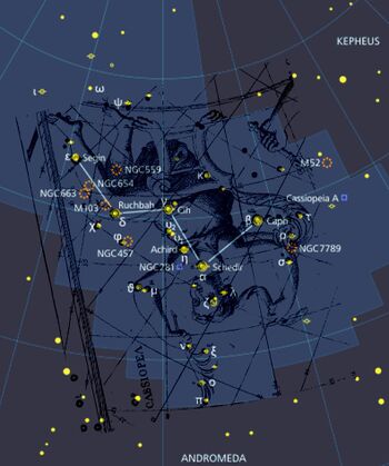 Ihre fünf Hauptsterne bilden ein markantes W beziehungsweise M am Himmel, daher wird sie auch als Himmels-W oder Himmels-M bezeichnet. Die Spitze in der Mitte des W zeigt ungefähr auf den Nordpolarstern, den man so mit Hilfe der Kassiopeia auffinden kann.