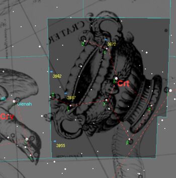 - ↑ Quelle für die Beschreibung und Mythologie: Wikipedia: Becher (Sternbild)