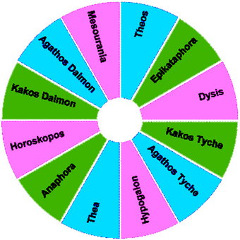 - Fünftes Haus: Agathe Tyche (agathe = gut, Tyche = Schicksalsgöttin, Fügung). Gutes Glück