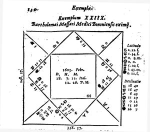 - ↑ Primum mobile by Placidus de Titis (Cooper translation), p.289, Kommentar:"Not only does it make early reference to the use of minor aspects (sesqui-quadrates and quintiles), Placidus considers mundane aspects as well as zodiacal aspects, parallels, mundane parallels, declinations, and even parallel declinations between planets in return charts and progressions!".