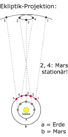 Dies ist natürlich nicht tatsächlich - objektiv, heliozentrisch - der Fall: die Planeten ziehen astronomisch ihre Bahnen stets in einer Richtung um die Sonne. Der vermeintliche Wechsel in der Laufrichtung der Planeten führte wissenschaftshistorisch zum Problem der Epizykel, das erst im 17. Jahrhundert von Johannes Kepler aufgelöst wurde.