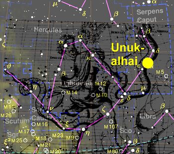 Unukalhai ist ein blasser gelber Stern im Nacken der Schlange. Seine Entfernung von uns beträgt etwa 73,2 Lichtjahre.[2] Die Hauptkomponente α Serpentis A ist ein Oranger Stern vom Spektraltyp K2III mit einer scheinbaren Helligkeit von +2,65 mag. Dieser besitzt die siebzigfache Helligkeit, bei einer Oberflächentemperatur von 4300 Kelvin und dem 15-fachen Radius unserer Sonne. 58 Bogensekunden weiter liegt α Serpentis B (Spektraltyp A3) mit einer scheinbaren Helligkeit von 11.8 mag; α Serpentis C, ein Stern 13. Magnitude, ist 2,3 Bogenminuten von A entfernt.