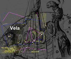Das Segel des Schiffs (Vela)[2] ist ein ausgedehntes Sternbild nördlich des "Kiel des Schiffs" (Carina).