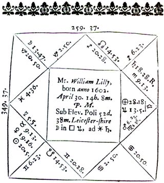 - ↑ Lillys Geburtsdatum wird bei verschiedenen Quellen mit 30.4.1602, greg. 2:08 angegeben. Es handelt sich jedoch, vergleicht man seine eigenen Angaben, um ein julianisches Datum. Die Zeitangabe beruht auf den alten Ephemeriden, die auf Mittagsständen (Meridianstände) basierten. Eine Zeitangabe von 14:08 Post Meridian (P.M.) bedeutet also 14:08 Stunden nach Mittag, das ergibt 2:08 Uhr des Folgetages. Die Zeitdifferenz von drei Minuten zum rekonstruierten Horoskop beruht auf der Differenz von LAT (Sonnenuhrzeit) zu LMT (mittlerer Ortszeit). Dies deckt sich auch mit der bei Gadbury abgebildeten Horskopzeichnung (nebenstehend).