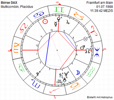 Das DAX-Chart hat nun auch einige Besonderheiten, die sich schon aus der Grundanlage ergeben. Da steht zum Beispiel die angesprochene Krebs-Sonne in Haus 10 in sehr genauer Opposition zu Neptun im Steinbock. Und in einem noch genaueren Trigon zu Pluto im Skorpion. Zwei Faktoren also, die sich in aller Regel den normalen „Einflüssen“ des Alltags entziehen, vor allem die Opposition zu Neptun bringt bisweilen heftige Ent-Täuschungen mit sich. Was das Trigon zu Pluto aber meistens wieder auffangen kann.