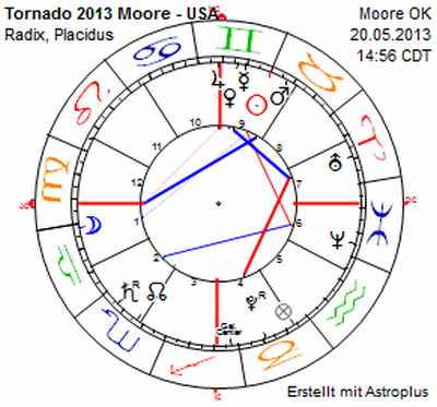 Heute Morgen dann die Bilder aus Moore / USA, eine Kleinstadt verwüstet von einem Tornado. Zu schnell, zu plötzlich sei er aufgetaucht, sagen Anwohner. Und sechszehn Minuten Vorwarnzeit ist dann selbst für die Bewohner einer Stadt, in der Tornados immer wieder zur Bedrohung werden, zu kurz. Was die Frage aufwirft: gäbe es denn vielleicht unter Umständen astrologische Signaturen innerhalb gewisser Zeitfenster, die solche Naturereignisse zumindest skizzieren könnten? Und damit, falls sich dann tatsächlich erste meteorologische Warnzeichen beobachten lassen, die Vorwarnzeiten verlängern könnten?