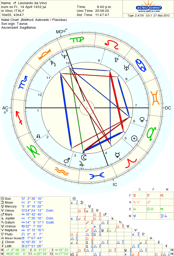 Und da gibt es noch viele andere, die jetzt "hinter der Zeit" sind und die Botschaft des Wassertrigons durch ihr Leben eingrenzen: Mit Neptun in 10 in Opposition zu Merkur, einem Schütze-AC und einer unendlichen Vernetzung von Wasser-Häusern und zeichen war auch Leonardo Da Vinci ganz ähnlich angelegt. Einer der sah, einer, der hoch begabt vernetzte und im Dasein fein vernetzt war. Früher als die anderen seiner Zeit aufgewacht, als alle anderen noch schliefen, wie einmal jemand schrieb. Manchmal kann Schlaf eben auch Leben heissen. Neptun umfasst immer alles zu früh Geborene, das, was noch gar nicht in der Welt ist und darum so weit, so unendlich ist, ebenso nah an der Wahrheit wie am Absurden, am Nonsens. Nach den Jahren der Feuerpumpe Pluto im Schützen und den vielen, vielen kleinen Lügen über den endlosen Fortschritt des Fortschritts eines Techno-Rappers namens Uranus im Wassermann kommen jetzt die Ahnungen wieder auf. Dass etwas gut ist, wenn es einfach wird, dass etwas richtig ist, wenn es nur wahr sein könnte, dass etwas wirklich ist, wenn es sich auflöst, wenn es sich selbst erleuchtet. Selbst Saturn im Skorpion macht vor Neptun im Trigon den Kniefall und bittet um ein bisschen Ethik, die tiefer geht als Strafen. Pluto als leicht verschobener Drachenkopf des Dreiecks setzt dann dem Ganzen den Hut auf - und wandelt. Es wird wehtun und es wird schön sein. Dem Himmel sei Dank, wir leben!