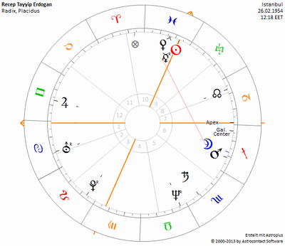 Erdogan mit seiner Grundanlage (Sonne, Venus und Merkur in den Fischen, Mond und Mars im Schützen) mag als Individuum der Meinung sein, dass es gut wäre, beides wieder mehr zu verbinden. Aber er wird unter dem Einfluss Neptuns erleben, dass Religion im Sinne der Fische eben keine Institution ist. Da geht es um eine Spiritualität, die sämtliche Fronten auflöst, deren Einsichten keinen Raum für ängstliche Abgrenzungen mehr lassen.