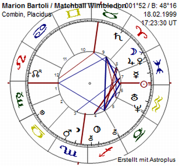 Das Zeit-Combin der frisch gebackenen Wimbledon-Siegerin Marion Bartoli setzt dann den I-Punkt auf das, was sich in der Synastrie zwischen ihr und Lisicki bereits andeutet. Das Spielende hat mit ihr einen exakten Mond-Jupiter in Haus 8 auf 1 Grad Widder, dem Neubeginn - im Sextil zum Neptun Spitze 6. Als sie die letzten Bälle schlägt, läuft Sonne über den Deszendenten. Beim Aus für die aufgeregte Sabine Lisicki, die nicht begreifen kann, was da eigentlich passiert, jenem unaufhaltsamen Ass, läuft Spitze 3 im Radix über Wimbledon auf den mundanen Pluto und löst den Faktor aus, der nicht nur im Transit auf Lisickis Neptun sitzt, sondern auch in der Opposition ihren Jupiter aushebelt. Sie selbst kann Bartoli nicht mehr verwirren. Bartolis Neptun hebelt damit letztlich Lisickis Sonne aus. Pluto sei Dank, oder Pluto sei's geklagt, je nachdem, von welcher Warte aus man es anschaut.