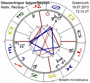 Im Radix des Trigon selbst (19. Juli) stößt man so auch auf einen gerade noch rückläufigen Merkur, der Jupiter, Saturn und Neptun im Wasser Raum lässt, statt der Weichenstellung sofort wieder konstruierten Sinn überzustülpen. Aber 24 Stunden später macht er bereits die Kehrtwende in die Sichtbarkeit. Pluto als Herr 1 in 3 will buchstäblichen Ausdruck einer stabilisierenden Ethik. Saturn holt Haus 3 umgekehrt nach 1 zurück und steht als Signum der substanziellen Effekte und Umwälzungen am Wasser-AC (Skorpion). Das sorgt für Nachhaltigkeit eines tiefen, seelischen Prozesses, in dem es immer wieder um eine ethisch wahres Sein und Leben für das unmittelbare Umfeld geht. Mars-Jupiter auf Spitze 9, im Haus, wo auch Sonne die (MC-Herrin) sitzt, wirkt dagegen wie ein Versprechen, dass diejenigen Ziele, Missionen und Visionen jetzt wahr werden können, die einen emotionalen Charakter haben und Gefühle nicht nur an der Oberfläche berühren. Uranus auf Spitze 6 lehnt aber jede Anpassung an Gewohntes ab und setzt Veränderungen radikal und feurig in eine Welt, deren Rituale objektiv Erneuerung brauchen.