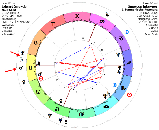 Der Veröffentlichung seiner ersten Informationen über Prism und die NSA am 06. Juni 2013, folgte drei Tage später ein Interview mit ihm, das ihn als Person in die Mitte des Skandals rückte. Und auch hier zeigen die aktuellen Transite, abgebildet als harmonische Resonanz, erstaunliches.
