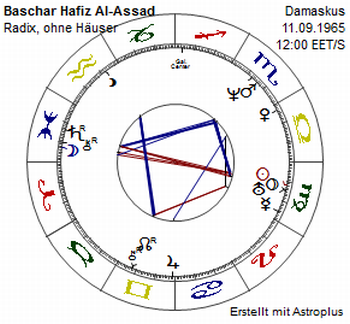 Baschar al-Assad hat, wie schon öfter erwähnt, selbst einen Fische-Mond. Die Sensibilität eines Kindes, auf die haltlos das harsche, praktikablere Dogma des väterlichen Erbes einströmt, Sonne-Uranus-Pluto aus der Jungfrau. Das ist das Drama des Unbewussten, Ungeschützten, in dem ein anderer Taktstock der Realität auf sich selbst wie andere einschlägt. "Auf Befehl von Präsident Dr. Baschar al-Assad, möge Gott ihn beschützen, und auf Befehl stolzer syrischer alawitischer Offiziere wurde heute Morgen gegen halb sechs Ost-Ghuta mit Chemiewaffen angegriffen, und die Operation wurde erfolgreich vollendet."