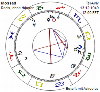 Dem Horoskop des Mossad fehlt leider die Zeit, aber die Zeichen-Stellungen für seine "Geburt" weisen bereits Verbindungen zu Arafat auf. Die Sonne in der Nähe des Galaktischen Zentrums im Schützen schafft eine mögliche Analogie zum 1.Haus-Jupiter im Todes-Horoskop, zumal sie ein Mars-Quadrat mitbringt. Ihre herausgehobene Position am GZ ist Beleg für die weltweite Bedeutung des Geheimdienstes und befindet sich nah an Arafats Saturn - der eine Blockierung, Störung, Hürde für den Mossad nicht nur andeutet. Zum angenommenen Zeitpunkt von Arafats möglicher Vergiftung läuft Pluto eng auf diese Mossad-Sonne zu, beim Tod hat er sie vermutlich erreicht. Das sagt für sich erst einmal nicht mehr, als dass der Geheimdienst damals weitreichende, umwälzende Spannungen und Veränderungen erlebte und in "Weltbewegendes" verwickelt gewesen sein kann.