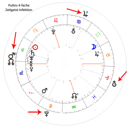 Das gerade erlebt Putin durch die Einbindung seiner Waage-Planeten in das große, mundane Quadrat. Veränderungen stehen an, und Putin hört dieses Ticken der Zeitgeist-Uhren. Ob er es aber richtig zuordnen kann, ob er es als Chance, ganz im eigenen Sinne Veränderungen herbeizuführen, begreift, oder nur als ungreifbare Bedrohung, das ist die entscheidende Frage.