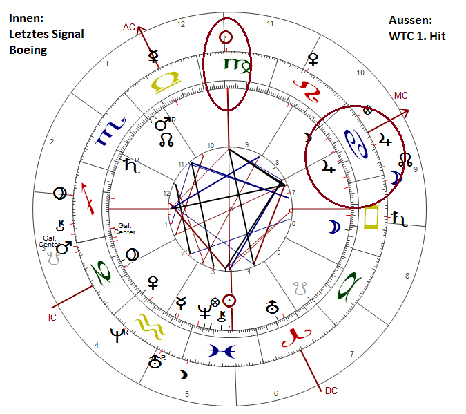 Betrachtet man allerdings die Achs-Überlagerung 12/6 plus Sonne dieses ersten WTC-Hits mit dem MC/IC des Signals oben, deutet sich auch an, dass der terroristische Verdacht unter Umständen reine Täuschung ist. Denn auch damals blieb schlussendlich offen, wer denn nun genau und auf welche Weise hinter dem schwarzen Tag für die ganze Welt steckte. Alles hängt letztlich wieder einmal an der Genauigkeit der Zeit. Und für die steht - bei dem Angaben-Chaos der malaysischen Behörden und der Fluggesellschaft - bislang schlicht der letzte Beleg aus.