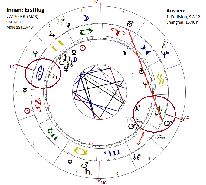 Was nun den kleinen vom großen, lebensgefährlichen Zwischenfall unterscheidet, ist die Art der Auslösung und der Grad der Vernetzung. Im August 2012 bereits blieb just diese Boeing, die jetzt verschwunden ist, auf dem Flughafen von Shanghai am Schwanz einer wartenden China Eastern Airlines Maschine hängen und riss sich eine Flügelspitze ab. Niemand wurde verletzt. Aber der Unfall ließ damals schon ahnen, dass sich für diese Maschine bei Jupiter-Auslösungen nichts wirklich Konstruktives anbahnen wird. Links die Grafiken, außen diesmal der Zeitpunkt der damaligen Kollision, innen wieder der Erstflug. Erneut ist Radix-Jupiter direkt betroffen, diesmal jedoch nur über den DC, während Radix-Merkur-Mond günstig von T-Jupiter überlaufen und der Rest des Clusters von Mars-Saturn gerade noch trigonal gestützt wird.