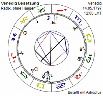 Das will man in Peking lieber doch nicht und gibt deshalb aktuell auch den klugen Konfuzius für den Rest der Welt. Uranus ergreift eindeutiger das Szepter - das machen all diese Trends zum Bruch klar, vom abstrusen bis nachvollziehbaren. Mundan im Widder, hat der Herr der Autonomie über den durch Waage rotierenden Mars (trigonal zu Venedigs Zwillinge-Stellium) als Herrscher ambivalenten Aufwind. Liegt nah, dass im damaligen Besetzungs-Horoskop durch Napoleon (links oben, Stunde nicht überliefert), das ja die Unabhängigkeit der stolzen Republicca di San Marco endgültig beendete, auch der Mond eher im hinteren Bereich der Ur-Plu-Beeinflussung vom Steinbock steht. Dazu kommt Neptun, der den sonst vorsichtigen Radix-Uranus mit seinen Verführungen aus der Opposition heraus zunebelt. Der geschichtliche Prozess, der sich gesamt-europäisch damit andeutet, ist nun ganz und gar nicht zu verachten. Denn schon spricht - als eins der wenigen westlichen Medien, die überhaupt Notiz vom Fall Venedig nehmen - die BBC auch das Thema Schottland und Katalonien an. Russische Medien dagegen (hier erhofft man sich vermutlich Bestätigung für das Krim-Referendum im Kampf gegen das Völkerrecht) nehmen Venedig als Präzedenz-Fall durchaus deutlich und entzückt wahr.