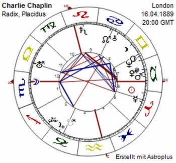 Sie liebten und verfluchten ihn, wenn er sie manchmal mit seinem Geh-Stöckchen aus Bambus buchstäblich wie Tiere vor sich her trieb. Mildred Harris war erst 16, als der Mann mit der raumgreifenden Stier-Venus-Mars-Konjunktion sie zur Ehefrau machte, Lita Grey auch. Paulette Goddard, die dritte im Ehebunde, kam mit 22 in sein Leben und log sich 5 Jahre jünger, bevor er sie später heiratete. Charles Spencer Chaplin, Widder (mit Skorpion-Mond, vermutlich am Skorpion-AC), hatte ein schwieriges, erotisches Muster. Mit 53 Jahren griff es noch einmal, bei Saturn Quadrat Merkur, als er zu Oona O'Neill, 18, damit stolze 35 Jahre jünger, ein letztes Mal "Ja, ich will!" sagte. Wollen und Wille waren überhaupt das Movens des Tramps mit dem Hitler-Bärtchen. 2000 Frauen will er gehabt haben.