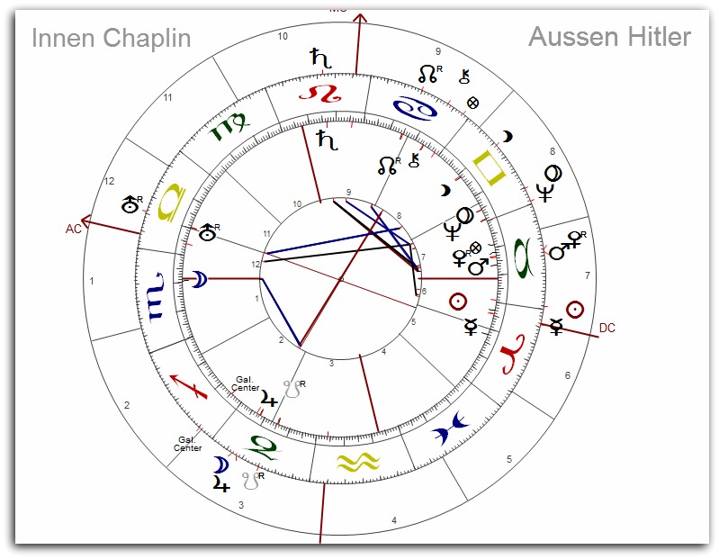 Wenn die "Chaplinoia" wieder ausbrach, das Zwingende seines Skorpion-Anteils mit dem Leuchten nach 7 hinein, durchwirkte Magie den Raum zwischen ihm und all den formbaren Mädchen-Frauen, die er so sehr begehrte. Vielleicht wollte er dabei immer nur sich - wie es manchmal so ist, wenn Mond am AC steht. Und dann die endlose Mühe um ein Optimum an Sicherheit - Jupiter Herr 2 in 2 als Gegenpol des skorpionischen Trauma. Dazu der Sexual-Stolz aus dem Stier, der Chaplin mit dem deutschen Diktator verband. So sehr er ihn auch später im Film abhandelte, absurd darstellte, verachtete. Charisma und Rigidität des "Tramps" banden sich zwar an andere Inhalte, in Intensität und Ausstrahlung allerdings glichen sich die Männer.
