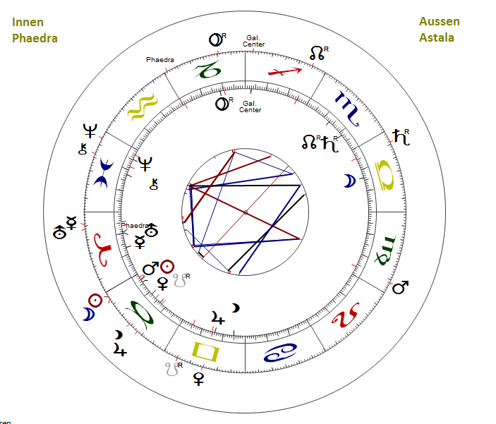 So sehr sich das Umfeld auch wünscht, er möge "nichts mitbekommen" haben. Ob diese erwünschte Blindheit etwas löst, kann sich keiner ernsthaft fragen. Schutz, der Realität beschönigt, ist kein Schutz. Er schwächt nur. Glück ergibt sich daraus nun mal selten bis nie. Während Astala wie Paula in einer besonderen Mond-Phase geboren ist (sie bei Vollmond, ihr Enkel bei Neumond), steht bei Phaedra Mars auf der Sonne, die Verletzung, der Angriff, über die Grade um die Sonne seiner Großmutter. Er hat auch hier die Begegnung mit dem Tod, nah der Stier-Venus, durch Opposition von Saturn-Nordknoten, auf dem Mond-Neptun von Paula Yates. Wobei Phaedras Südknoten bei der Venus schon ein Wegweiser in die Vergangenheit ist.