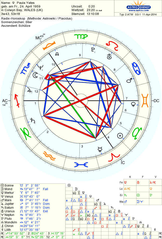 Am 17. September 2000, nur zwei Jahre nach den Trennungs-Eskalationen, die Paula dennoch offenbar nicht zu dem bringen, was man den "gewohnheitsmäßigen Konsum harter illegaler Drogen" nennt (sie soll eben keine Heroin-Toleranz wie eine Süchtige entwickelt haben), wird sie tot in ihrer Wohnung gefunden. Ausgerechnet am 10. Geburtstag von Pixie, ihrer jüngsten Tochter von Geldof. Bei ihr wartet die vierjährige Tiger Lily, die ihre tote Mutter nicht wecken konnte, dass sie jemand holt. Die Transite der Familie sind an diesem Tag mit Mars-Saturn-Quadrat auf 0° Jungfrau, 1° Zwillinge, brutal. Hier einige der Überläufe:
