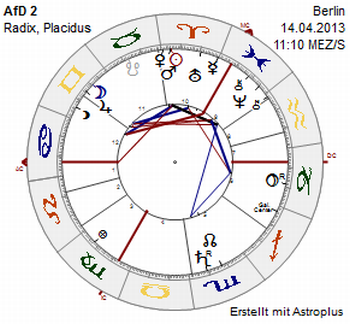 Nicht mehr lange allerdings, dann ist Saturn-Neptun mundan vorbei (dessen Schatten nun mal der gespiegelte, hoch aggressive Merkur-Mars vom Jahresbeginn darstellt, der weiter wirkt). Dann empfängt die AfD, wie sie jetzt ist, als Partei mit neptunischen Verirrungen, den Neptun-Saturn versetzt über ihren Chiron und Mond/Jupiter (Quadrat). Auch ihr drohen also Konkurse. Was heißen kann, sie wird durch Schlimmere ersetzt. Oder aber, dass den wirren Rechts-Rucks doch noch Vernunft folgt.